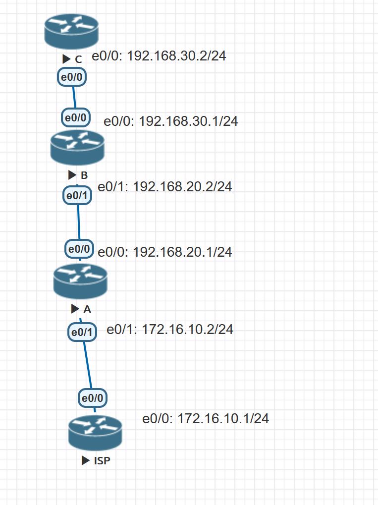 下图为一个实例,ABC三个路由器为内网设备,ISP为公网路由器,172.16.10.0/24位公网网段,路由器A为边界路由器。