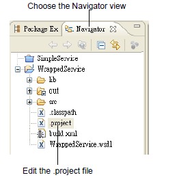 接下来,我们进行验证。拷贝工程SimpleService并保存为工程WrappedService.删除所有的Java 文件。”out”文件夹依然链接到原来的位置(c:\axis\repository\services\SimpleService).切换到eclipse导航视图并打开.project 文件: