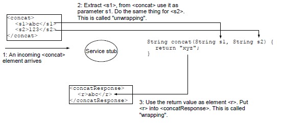 接下来一个步骤非常重要:我们需要一个特殊的service stub,怎么个特殊法呢?它可以执行一些特殊的处理操作(如下图所示). 当一个<concat>元素到来时,service stub 将从<concat>元素中获得<s1>和<s2>两个元素,并把这两个参数作为两个参数的值(这个功能成为解封装”unwrapping”).当服务返回一个字符串,service stub将把这个返回值作为<r>元素的值,并且把<r>元素放入到<concatResponse>元素中(这个功能称为封装”wrapping”):