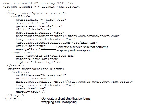 这里需要注意的是,这个service依然是一个文档类型的service。客户端依然用相同的方式对其调用(除了<concatRequest>改为了<concat>). 不同的是service stub调用你的实现并且如何处理返回值。这些不同队客户端来说是透明的。为了生成这样的service stub,需要在Ant任务<wsdl2code>加上选项: