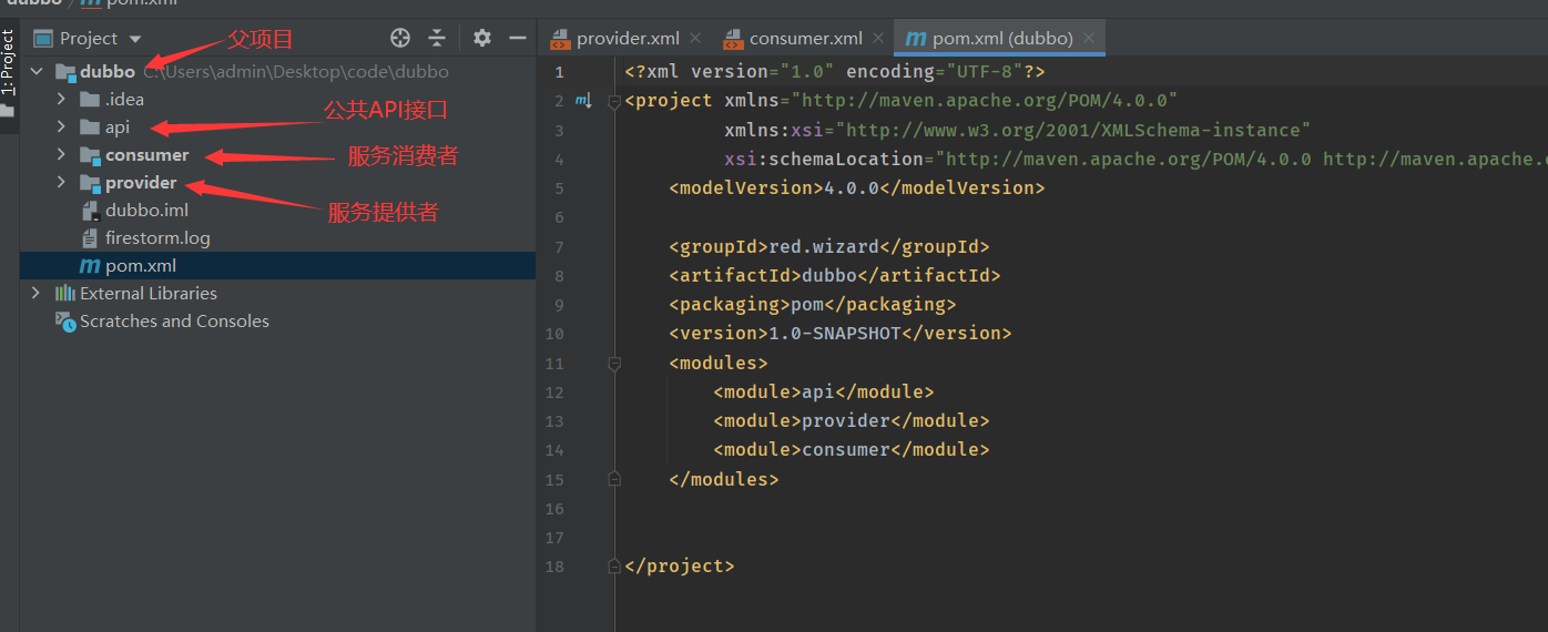 - dubbo: 父项目, idea 新建项目后 删除 src 文件, 主要用于管理子模块