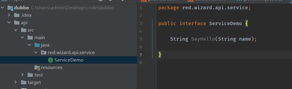 在 api 子模块 src 下面新建类 ServiceDemo ,定义测试接口 SayHello