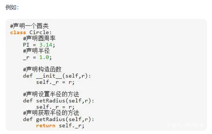 Circle类有两个成员属性,分别是PI(圆周率)、_r(半径),PI属性被修饰为常量,_r被修饰为私有变量,禁止外部访问和修改。外部如果要访问和修改_r属性,需要调用类提供的getRadius()和setRadius()方法,如getRadius()方法可以获取_r属性的值,setRadius()方法可以设置_r属性的值。属性的初始化可以通过类的构造方法来实现。
