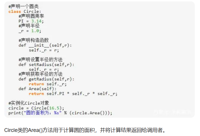 其中def是声明方法的关键字,method是要声明的方法名称,语句块另起一行书写。例如在声明的Circle类中,getRadius()和setRadius()都是类方法。