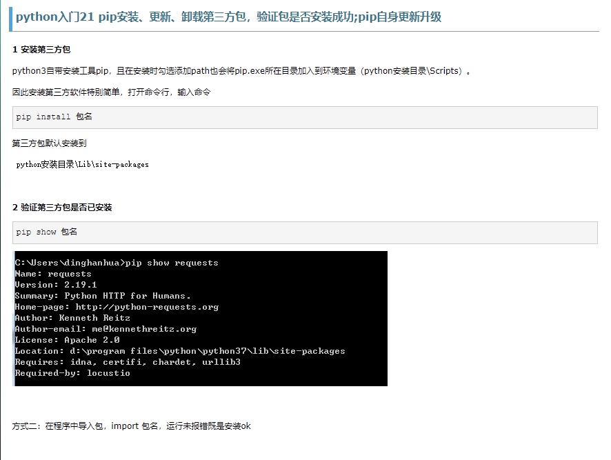 方法一:输入pip show +包名,如果安装成功则可看到第三方包的信息,如下图所示;