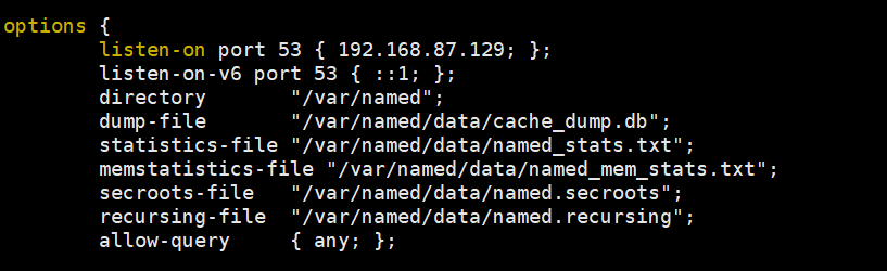 listen-on port 53 { any; };> # any为允许所有主机或者修改为允许监听的主机IP(注意IP前后均有空格)
