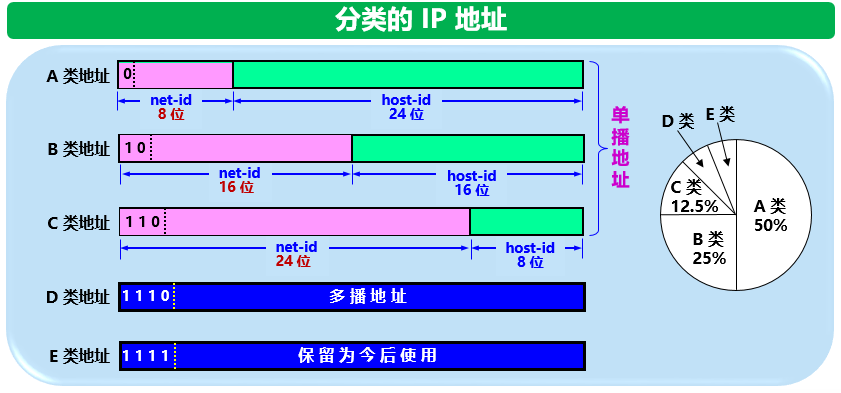 到了网络层,所有连接到互联网的主机(或路由器)的接口都会被分配到一个 IP 地址,这个 IP 地址不仅标志了这个主机(或路由器),而且还标志了此接口所连接的网络。在互联网发展早期采用的是分类的 IP 地址,其中 A、B、C 类地址都是单播地址(一对一通信),D 类是多播地址(一对多通信,使用网际组管理协议 IGMP 和多播路由选择协议),而 E 类是保留地址。