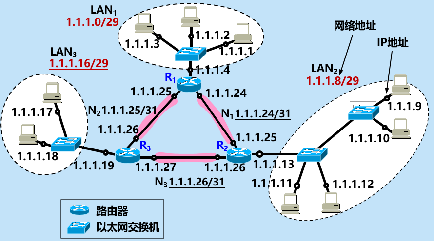 - 两个路由器直接相连的接口处,可指明也可不指明 IP 地址。如指明 IP 地址,则这一段连线就构成了一种只包含一段线路的特殊“网络”。这种网络仅需两个 IP 地址,因此这里就使用了 /31 地址块,主机号可以是 0 或 1 。