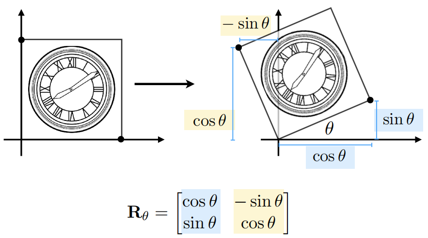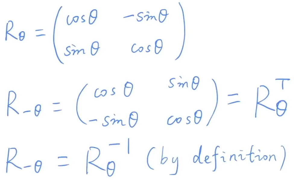 旋转 -θ 角度如下。可以看到,旋转 -θ 角和旋转 θ 角的转置是相等的。从定义上来看,旋转 -θ 角其实就是旋转 θ 角的矩阵得到的逆。