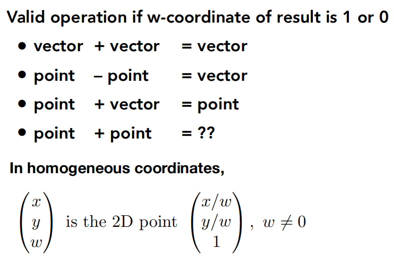 我们从新的概念上看,向量相加仍然是向量,坐标点相减得到向量,坐标点与向量相加得到坐标点,这都符合我们原先对于向量的概念。而在这里,点与点相加,意味着第三个维度不再是 1,我们假设为 w,则三个维度都除以 w,得到新的坐标点,这个坐标点其实是两个坐标点的中点。