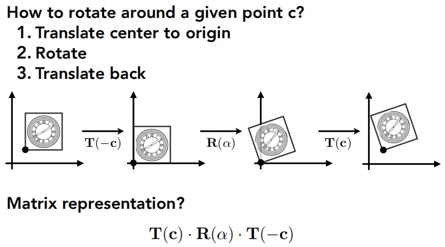 先平移向量 c 到原点位置,再进行旋转操作,最后再平移向量 c 回去。矩阵形式在上面。