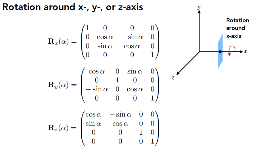 绕 x 轴的旋转,x 是不变的,反映在矩阵中就是左上角 3 * 3 的矩阵中第一行是 1 0 0,第一列是 1 0 0。而那个 2 * 2 的矩阵就是对 y、z 平面进行的 α 角度的旋转。