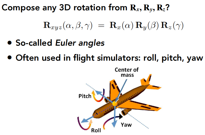 能够用简单的旋转组合成复杂的旋转,分别绕三个轴旋转 α角、β角、γ角,这三个角又被称为欧拉角。可以形象的看作飞机滚转(Roll);飞机俯仰(Pitch);飞机偏航(Yaw)。
