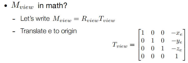 现在两个矩阵都求出来了,先做旋转再做平移,Mview 这个变换就叫做视图变换。相机要通过这种变换,到一个固定或约定俗成的位置上。其它所有物体也都需要跟着做这样一个变换。