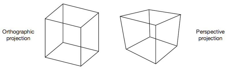 投影有正交投影(Orthographic Projection)和透视投影(Perspective Projection)。由三维投影到二维。