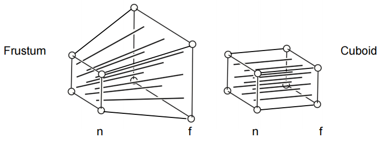 透视投影四棱锥中物体放置的那块区域叫做 frustum,将区域内的物体投影到近处的苹面上。