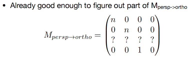 针对一个点,它上下如何挤压,z 不知道。现在的情况是,我希望找出 ( x, y, z, 1 ) 左边乘上的那个矩阵,把它变成右边这样,有三个数我都已经知道了,那么我现在已经可以填上若干值了。