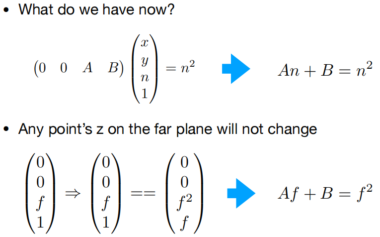 用到上面的两点:近苹面所有点变换前后都不会发生变化;远平面所有点变换前后 z 也不会发生变化。