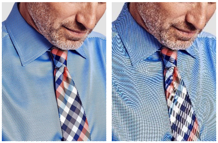 上图是采样所产生的另外一个 artifacts,叫摩尔纹。将左边这幅图的奇数行和奇数列都去掉,然后得到的一个小的图,显示还是一样大,就是右边图片的效果。日常生活中也能见到,比如拿手机拍显示器的屏幕。