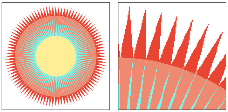 比如原先我显示器分辨率很差,一个像素非常大,很明显可以看出来,那我用它去光栅化一个三角形,当然看起来锯齿很严重;而如果我用现在的高分辨率显示器,像素小一些,意味着像素跟像素之间间隔小,意味着采样频率高,在频谱上的搬移间隔大,就不容易出现频谱的混叠。