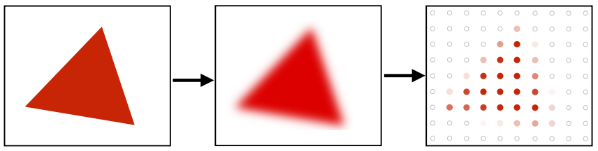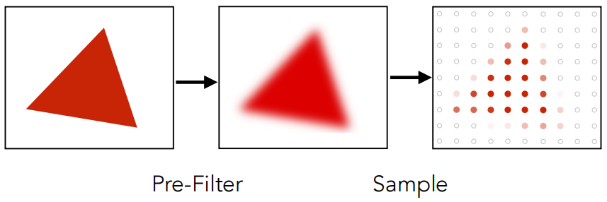 模糊做完了,那采样将变得无比简单,格子是什么样采样就什么样了。(强调一下,MSAA 是做模糊的操作,MSAA 也绝不是靠提高分辨率直接解决的走样问题,只是为了得到近似的三角形的覆盖)
