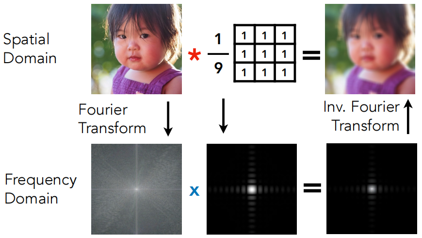 那么通过卷积定理我们知道可以通过两种办法做一个卷积,拿到一幅图,我可以直接拿一个滤波器做一个卷积操作,也可以将这幅图先傅里叶变换到频域上,把卷积的滤波器也变换到频域上,把两者相乘,然后再通过逆傅里叶变换到时域上,也完成了一个卷积操作。图示如下: