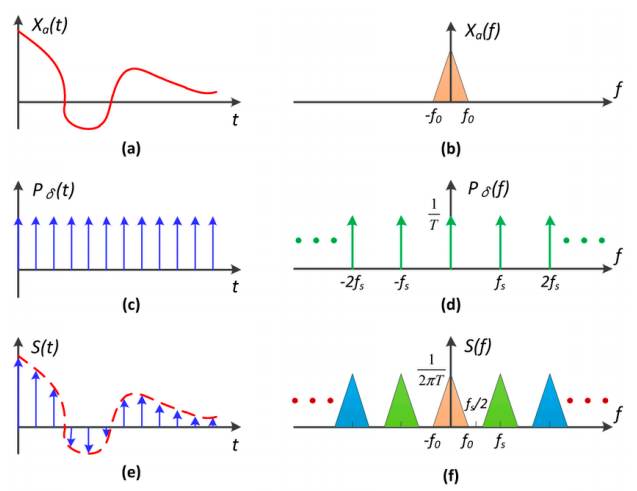 图 (a) 是待采样的函数,那么我想对其进行采样,就乘以另外一个函数 (c),只在一些固定位置上有值,而其他位置上结果为 0。那么得到的就是函数 (a) 上面离散的点。这里的函数 (c) 叫做冲激函数。而时域上的乘积对应到频域上就是卷积,对应的右边三幅图。