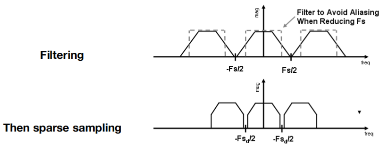 我们首先做一个模糊,将它的高频信号砍掉,那么剩下的信号就是第二幅图的形状,然后我再以一个稀疏的采样率来进行采样,现在就能发现对应的信号在原先的位置不再发生混叠了。