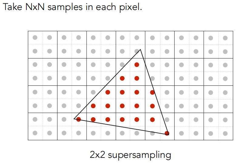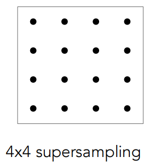 原本我们只看一个像素点,那么我们将这一个像素划分成 4 * 4 的一个个小的像素,每一个小的像素有一个中心,我可以判断这些点是不是在三角形内,然后我们再把这些判断的结果平均起来,就可以看作三角形对这个大的像素区域的一个近似。