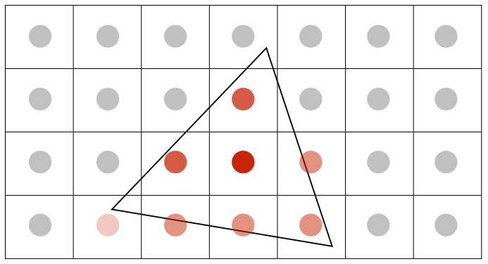 比如我们先划分成 2 * 2 的子采样点,然后每个点都能判断是否在三角形内。