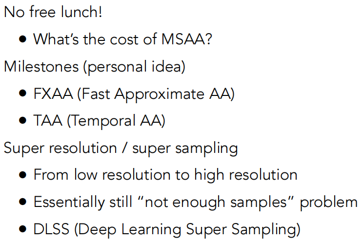 在这里只提到了一种抗锯齿,显然无法代表现代图形学的发展,抗锯齿的方案当然有很多。比如 FXAA 是对图像的后期处理,我先得到有锯齿的图,我再对它进行操作(前面我们就使用先采样后模糊的方法),先将有锯齿的边界找到,然后再进行匹配,用没有锯齿的边界换上,而且非常非常快,它是和采样无关的图像方面做的抗锯齿,效果挺好的。TAA 是最近几年兴起的抗锯齿的方法,非常简单高效,Temporal 就表示和时间相关的,我去找上一帧的信息,假如说不是一个运动的场景,是一个静止的场景,相邻两帧显示的东西一样,TAA 它会说我复用上一帧感知到的结果,就是说上一帧像素的值在这一帧还会发生作用,相当于 MSAA 对应的这些样本给分布在时间上。