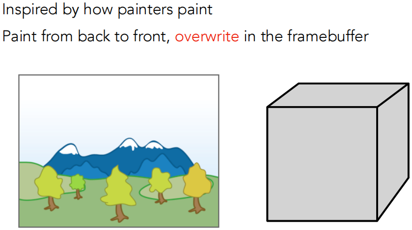 在场景中有很多不同的物体,我想把这些物体都显示在屏幕上,一个很自然的想法就是我们先从最远处的物体开始画起,然后逐渐用近的物体进行覆盖。这种算法叫做画家算法。这也是油画的画家所做的。