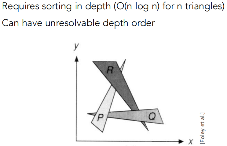 在一定程度上,画家算法是没问题的。如果有 n 个三角形,算法复杂度为 O(n log n),因为基于最快的排序算法。