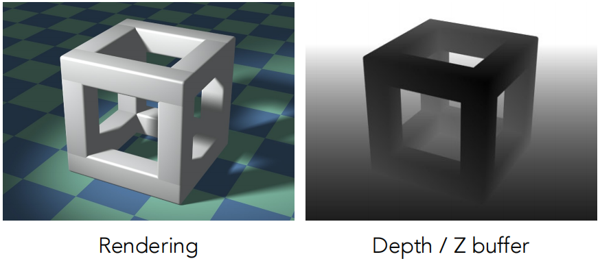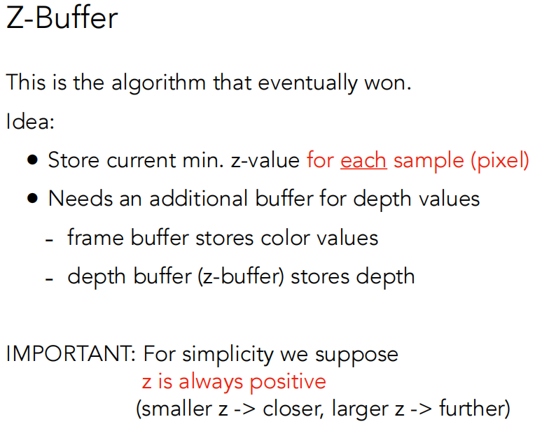 现在我们广泛采用的算法是 Z-Buffer,思路是既然我对空间中三角形的远近顺序不好排,而对每一个像素来说挺容易分析的,对于每一个像素,我考虑的是离我最近的距离。那么在生成这幅图像的同时,还会生成每一个像素它能看到的物体的最浅的深度的信息,我们管这幅图叫深度图或深度缓存。即最后获得 frame buffer 和 depth buffer,这两幅图总是同步生成的。
