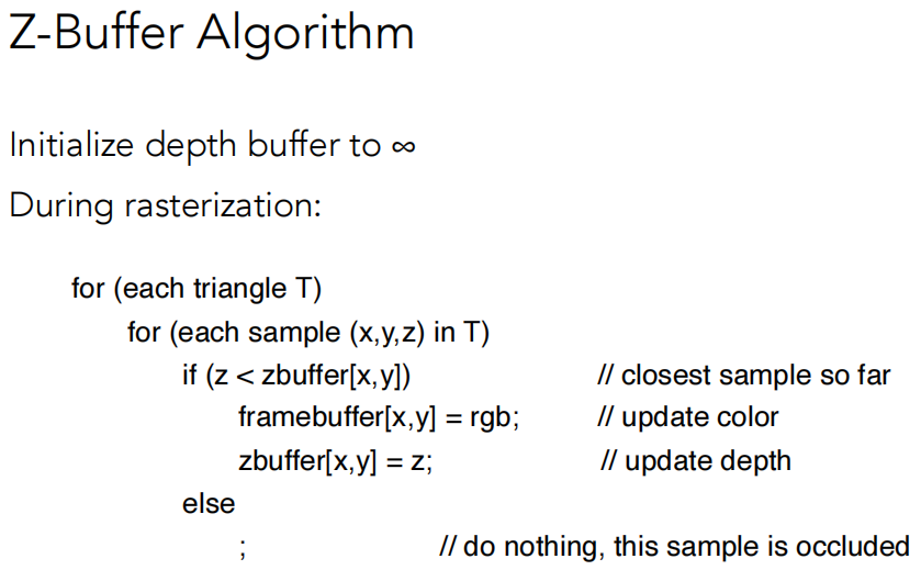 因为我们并没有排序,所以 Z-Buffer 算法的复杂度为 O(n),对于 n 个三角形,每一个像素它只是得到最小值而已。