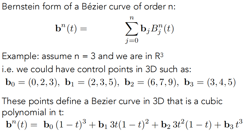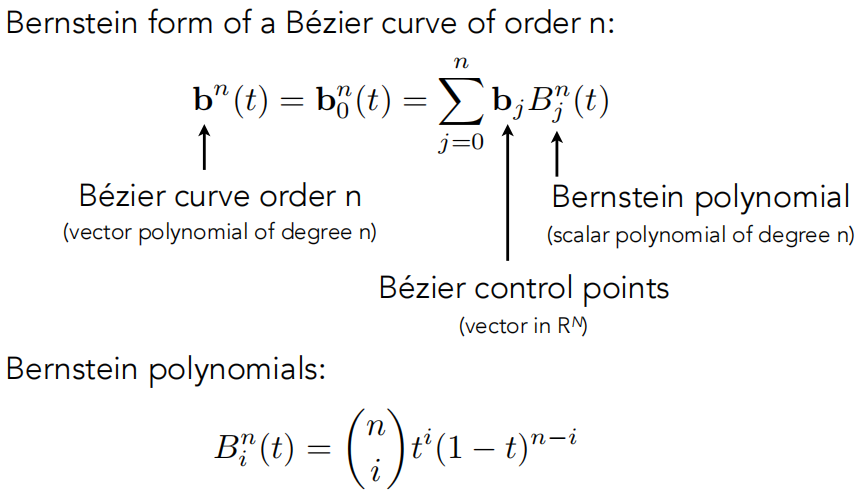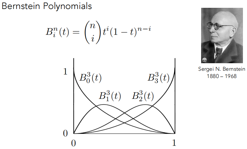 简化一下,任意阶数的贝塞尔曲线在任意时刻 t 上的点的位置,就是由伯恩斯坦多项式作为系数对给定控制点的加权。
