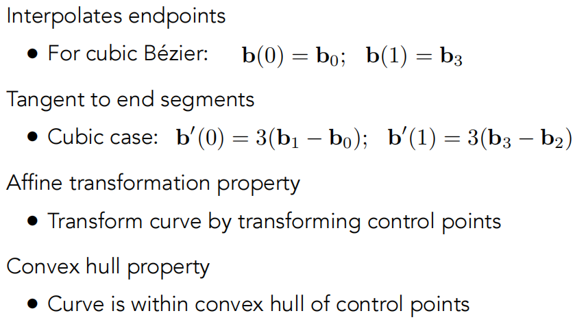 贝塞尔曲线规定了很多不错的性质,如曲线必须过起点和终点,并且起始和终止切线的方向一定是 3 倍的 b1 - b0 和 b3 - b2(以四个控制点为例,其它的并不一定是 3),仿射变换不变性,曲线一定在控制点的凸包内。
