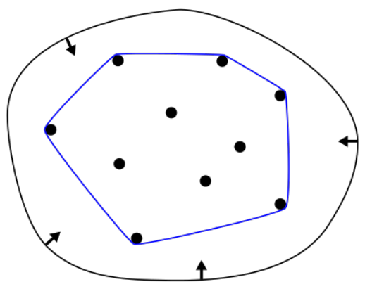 凸包:能够包围一系列给定的几何形体的最小的凸多边形。就像一块木板钉上很多钉子,你用一个橡皮筋能够框住的最大形状叫做凸包。
