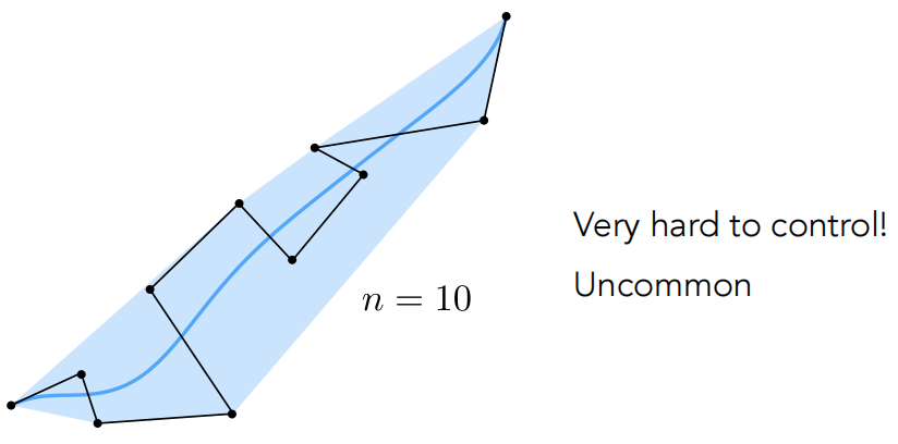 比如一系列控制点在一条直线上,要画出它的贝塞尔曲线,那这条曲线一定是画在这条直线上,因为凸包的限制。你会知道贝塞尔曲线绝对不会超过给定的控制点形成的凸包的范围内。