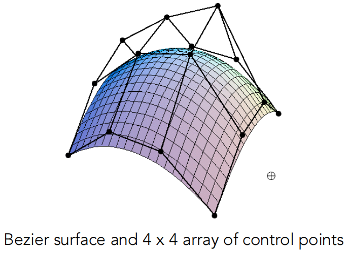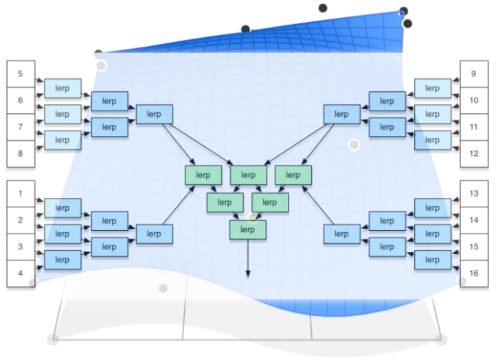 其实还是先从水平方向做一下贝塞尔曲线,再从垂直方向上做一下贝塞尔曲线,最后得到的贝塞尔曲面。