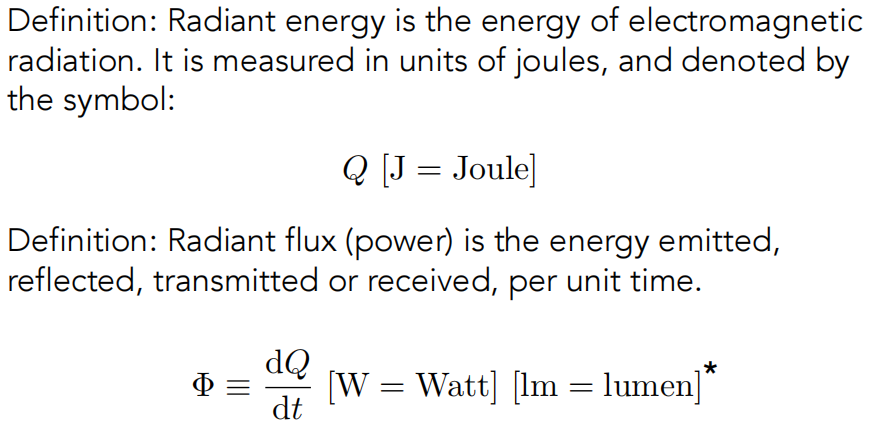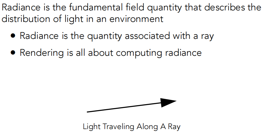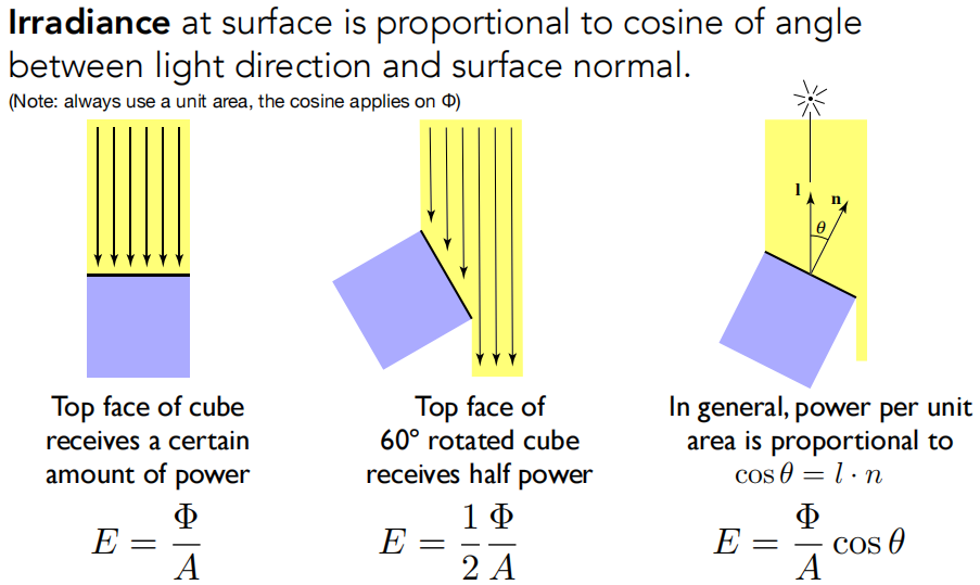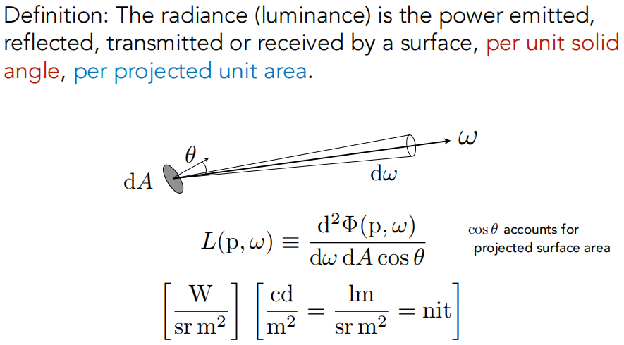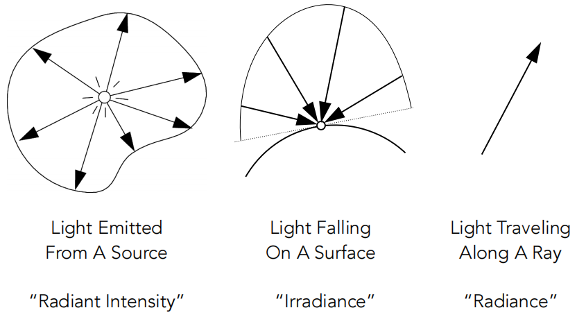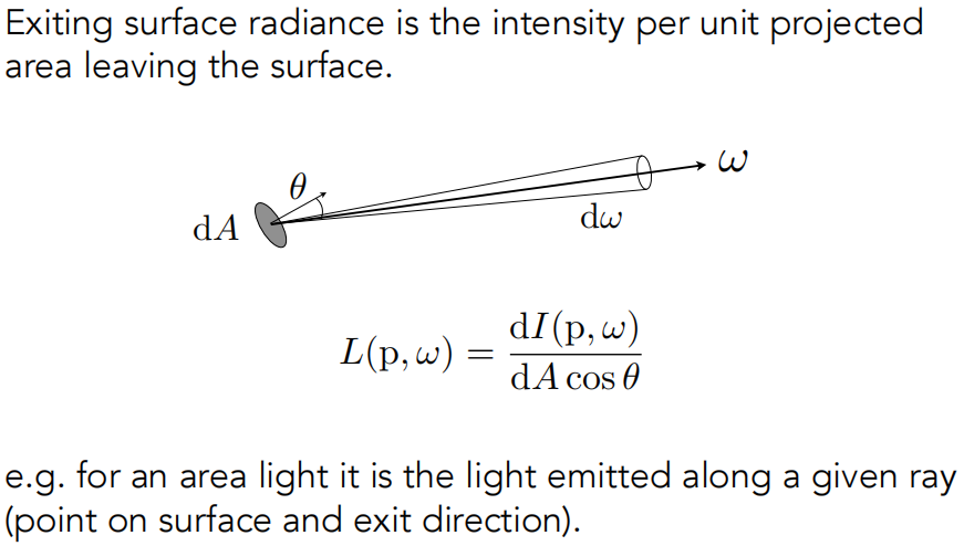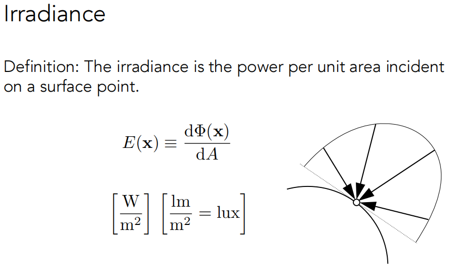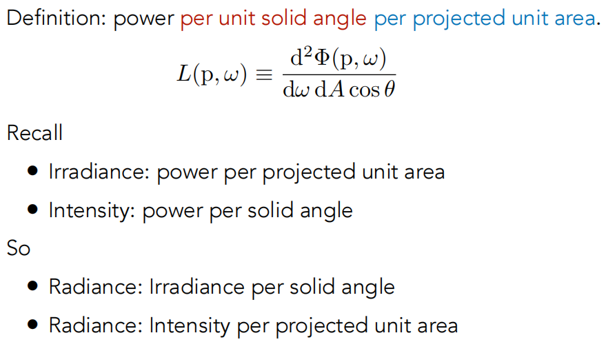 Intensity per projected unit area:从一个方向打到一个小的面上面去,到达这个面的时候会有多大的能量。而这个面如果考虑来自环境中四面八方的能量,我就可以总共收到了多少能量,即 Irradiance。