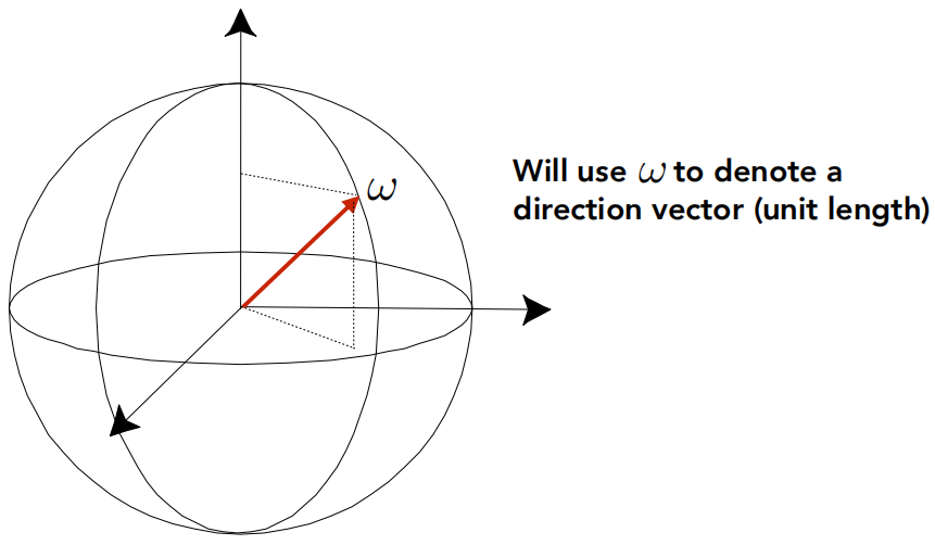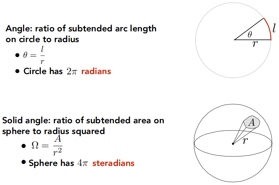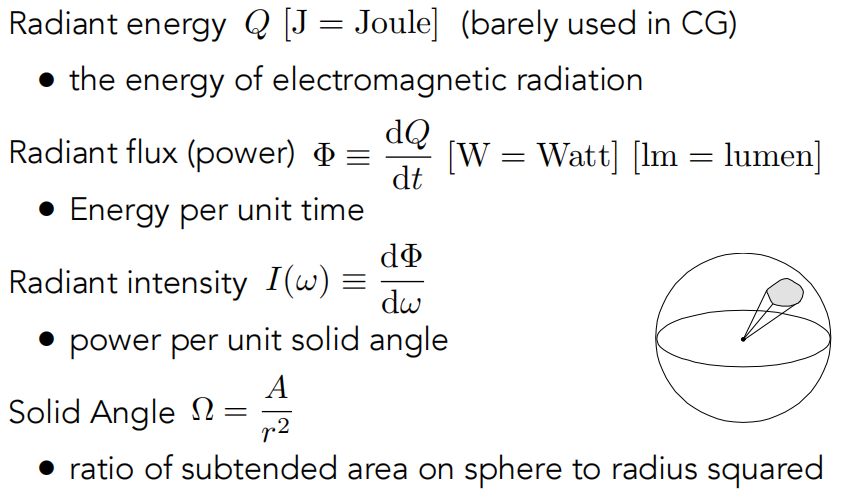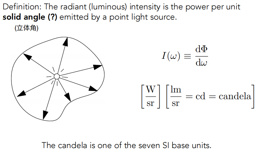不管是什么样的光源总是在不断辐射出来能量。在图形学里很少用这个概念,因为比如太阳能板,它光照时间越长吸收能量越多,所以正常来说,我们为了分析一些能量相关的问题,考虑的都是单位时间的能量。这就是为什么我们引入了 power,对应到灯泡上,就是灯泡的功率,即单位时间内的能量。而 intensity 就是在一个立体角上的能量。立体角的定义如下,从球心往这个物体看过去,在单位球的球面上会交出一个面,这个面的面积除以单位球半径的平方(就是 1),这就是立体角。一个物体投影到单位球上,即与单位球球心进行连线,框出的面的面积就是它的立体角。