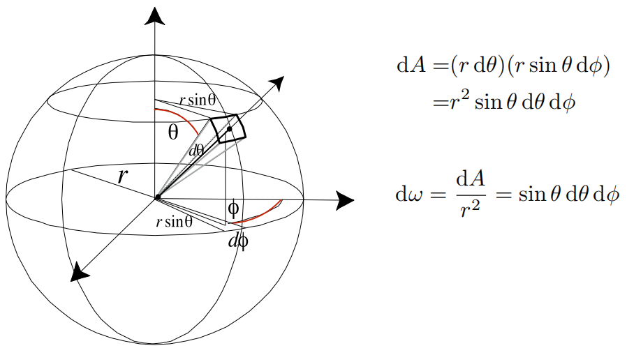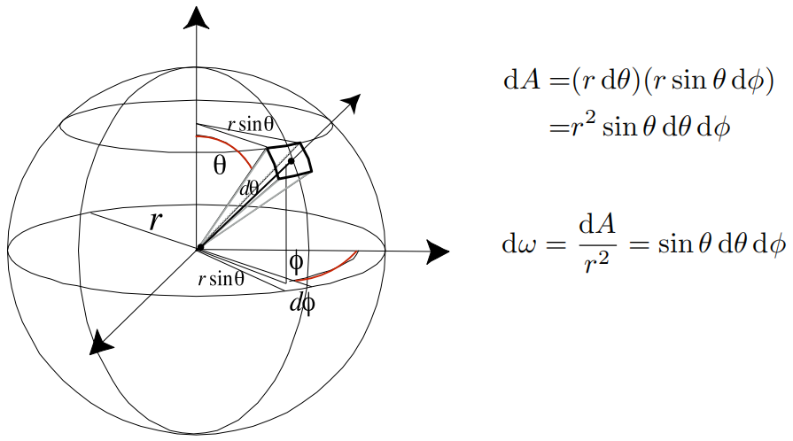Irradiance per solid angle:光源的能量可以往各个方向辐射,但是我只考虑往一个方向会辐射多大的强度。