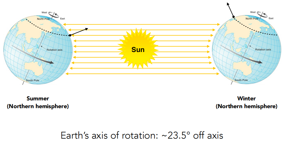 地球上的四季,因为阳光和不同区域的夹角是不一样的。