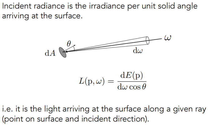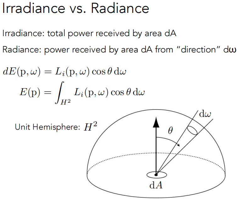 Irradiance 就是这个 dA 收到的所有的能量,Radiance 就是我从某一个方向进来,它让 dA 收到的能量。