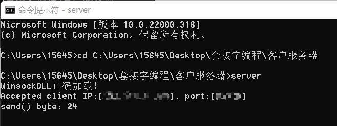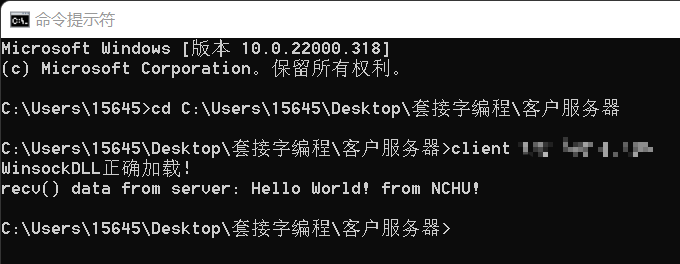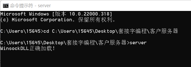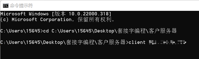 在我自己的电脑内打开两个命令提示符,分别运行服务器端和客户端,相当于在局域网内进行套接字通信。