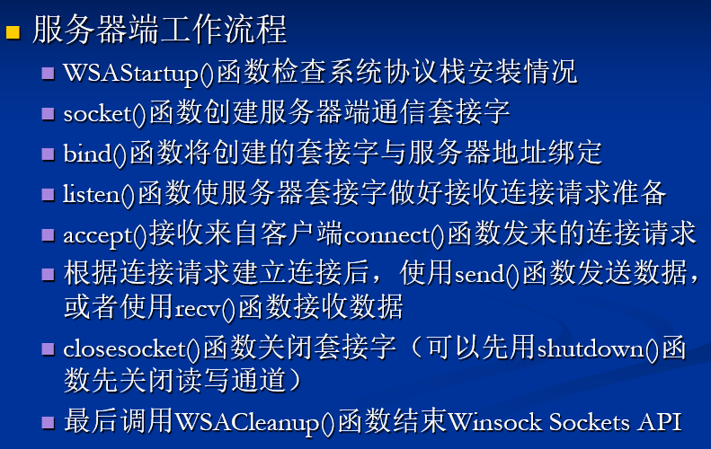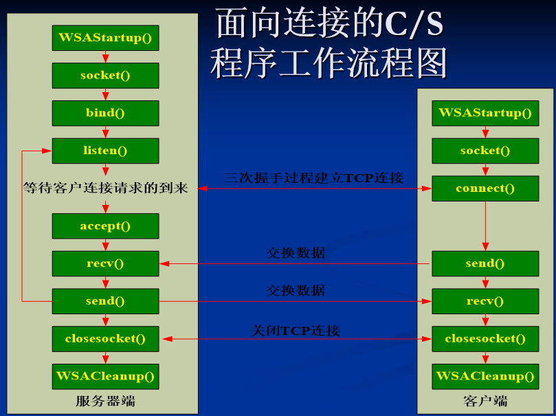 1 #include <stdio.h> 2 // Winsock是一个基于Socket模型的API 3 #include <winsock2.h> 4 5 // 要包含头文件 Winsock2.h,就需要调用库 ws2_32.lib 6 #pragma comment( lib, "ws2_32.lib" ) 7 8 9 10 /* Winsock启动测试,检查系统协议栈安装情况 */ 11 void TestWinsockStartup(); 12 13 14 15 int main( int argc, char* argv[] ) { 16 // 0. Winsock启动测试 17 TestWinsockStartup(); 18 19 20 SOCKET sListen, sAccept; 21 // 客户端地址长度、发送数据长度 22 int iLen, iSend; 23 // 要发送给客户的信息 24 char buf[] = "Hello World! from NCHU!"; 25 // 服务器和客户的地址 26 struct sockaddr_in ser, cli; 27 // 初始化客户地址长度 28 iLen = sizeof(cli); 29 30 // 1. 创建服务器端通信套接字 31 sListen = socket( AF_INET, SOCK_STREAM, 0 ); 32 if( sListen == INVALID_SOCKET ) { 33 printf("socket() Failed: %d\n", WSAGetLastError()); 34 return -1; 35 } 36 37 // 2. 将创建的套接字与服务器地址进行绑定 38 ser.sin_family = AF_INET; 39 ser.sin_port = htons( 5050 ); // 端口号 5050 40 ser.sin_addr.s_addr = htonl( INADDR_ANY ); 41 if( bind(sListen, (LPSOCKADDR)&ser, sizeof(ser)) == SOCKET_ERROR ){ 42 printf("bind() Failed: %d\n", WSAGetLastError()); 43 return -1; 44 } 45 46 // 3. 进入监听状态 47 if( listen(sListen, 5) == SOCKET_ERROR ) { 48 printf("lisiten() Failed: %d\n", WSAGetLastError()); 49 return -1; 50 } 51 52 // 4. 进入一个无限循环,等待客户的连接请求 53 while(1) { 54 // 4.1 接收来自客户端由 connect()发出的连接请求 55 sAccept = accept( sListen, (struct sockaddr *)&cli, &iLen ); 56 if( sAccept == INVALID_SOCKET ) { 57 printf("accept() Failed: %d\n", WSAGetLastError()); 58 return -1; 59 } 60 // 输出客户 IP地址和端口号 61 printf("Accepted client IP:[%s], port:[%d]\n", inet_ntoa(cli.sin_addr), ntohs(cli.sin_port)); 62 63 // 4.2 给连接的客户发送信息 64 iSend = send( sAccept, buf, sizeof(buf), 0 ); 65 if( iSend == SOCKET_ERROR ) { 66 printf("send() Failed: %d\n", WSAGetLastError()); 67 break; 68 } else if(iSend == 0) { 69 break; 70 } else { 71 // 成功发送数据 72 printf("send() byte: %d\n", iSend); 73 } 74 closesocket(sAccept); 75 } 76 77 closesocket(sListen); 78 WSACleanup(); 79 return 0; 80 } 81 82 83 84 /* Winsock启动测试,检查系统协议栈安装情况 */ 85 void TestWinsockStartup() { 86 WORD wVersionRequested; 87 WSADATA wsaData; 88 wVersionRequested = MAKEWORD(2, 2); 89 90 if( WSAStartup(wVersionRequested, &wsaData) != 0 ) { 91 printf("Winsock初始化错误!\n"); 92 return ; 93 } 94 if( wsaData.wVersion != wVersionRequested ) { 95 printf("Winsock版本不匹配!\n"); 96 WSACleanup(); 97 return ; 98 } 99 printf("WinsockDLL正确加载!\n"); 100 }