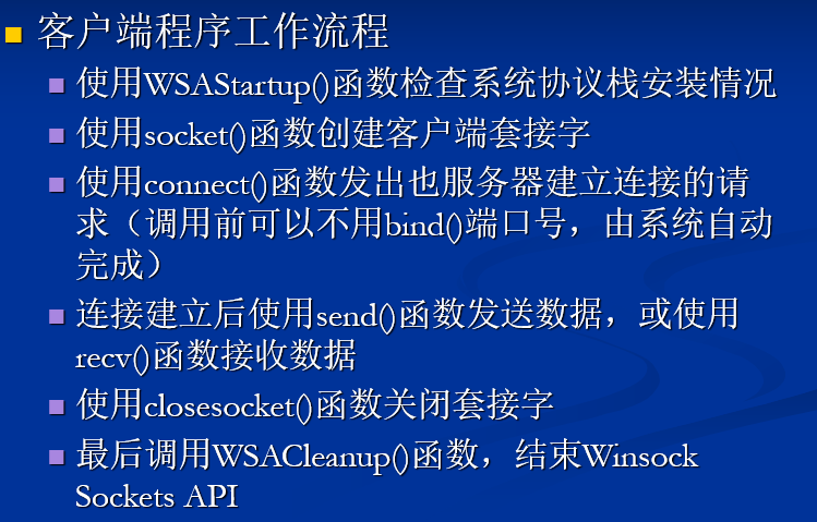 1 #include <stdio.h> 2 // Winsock是一个基于Socket模型的API 3 #include <winsock2.h> 4 5 // 要包含头文件 Winsock2.h,就需要调用库 ws2_32.lib 6 #pragma comment( lib, "ws2_32.lib" ) 7 8 9 10 /* Winsock启动测试,检查系统协议栈安装情况 */ 11 void TestWinsockStartup(); 12 13 14 15 int main( int argc, char* argv[] ) { 16 // 0. Winsock启动测试 17 TestWinsockStartup(); 18 19 SOCKET sClient; 20 // 从服务器端接收的数据长度 21 int iLen; 22 // 接收数据的缓冲区 23 char buf[1024]; 24 //接收缓冲区初始化 25 memset( buf, 0, sizeof(buf) ); 26 // 服务器端地址 27 struct sockaddr_in ser; 28 29 // 命令行参数输入是否正确:client [Server IP] 30 if( argc < 2 ) { 31 //提示在命令行中输入服务器 IP地址 32 printf("Usage: client [server IP address]\n"); 33 return -1; 34 } 35 36 // 1. 填写要连接的服务器地址信息 37 ser.sin_family = AF_INET; 38 ser.sin_port = htons( 5050 ); 39 // 将命令行中输入的点分 IP地址转换为二进制表示的网络字节序 IP地址 40 ser.sin_addr.s_addr = inet_addr( argv[1] ); 41 42 // 2. 建立客户端流式套接字 43 sClient = socket( AF_INET,SOCK_STREAM, 0 ); 44 if( sClient == INVALID_SOCKET ) { 45 printf("socket() Failed: %d\n", WSAGetLastError()); 46 return -1; 47 } 48 49 // 3. 请求与服务器端建立 TCP连接 50 if( connect(sClient, (struct sockaddr *)&ser, sizeof(ser)) == INVALID_SOCKET ) { 51 printf("connect() Failed: %d\n", WSAGetLastError()); 52 return -1; 53 } else { 54 // 从服务器端接收数据 55 iLen = recv( sClient, buf, sizeof(buf), 0 ); 56 if( iLen == 0 ) { 57 return -1; 58 } else if( iLen == SOCKET_ERROR ) { 59 printf("recv() Failed: %d\n", WSAGetLastError()); 60 return -1; 61 } else { 62 // 输出接收到的数据 63 printf("recv() data from server: %s\n", buf); 64 } 65 } 66 67 closesocket(sClient); 68 WSACleanup(); 69 return 0; 70 } 71 72 73 74 /* Winsock启动测试,检查系统协议栈安装情况 */ 75 void TestWinsockStartup() { 76 WORD wVersionRequested; 77 WSADATA wsaData; 78 wVersionRequested = MAKEWORD(2, 2); 79 80 if( WSAStartup(wVersionRequested, &wsaData) != 0 ) { 81 printf("Winsock初始化错误!\n"); 82 return ; 83 } 84 if( wsaData.wVersion != wVersionRequested ) { 85 printf("Winsock版本不匹配!\n"); 86 WSACleanup(); 87 return ; 88 } 89 printf("WinsockDLL正确加载!\n"); 90 }