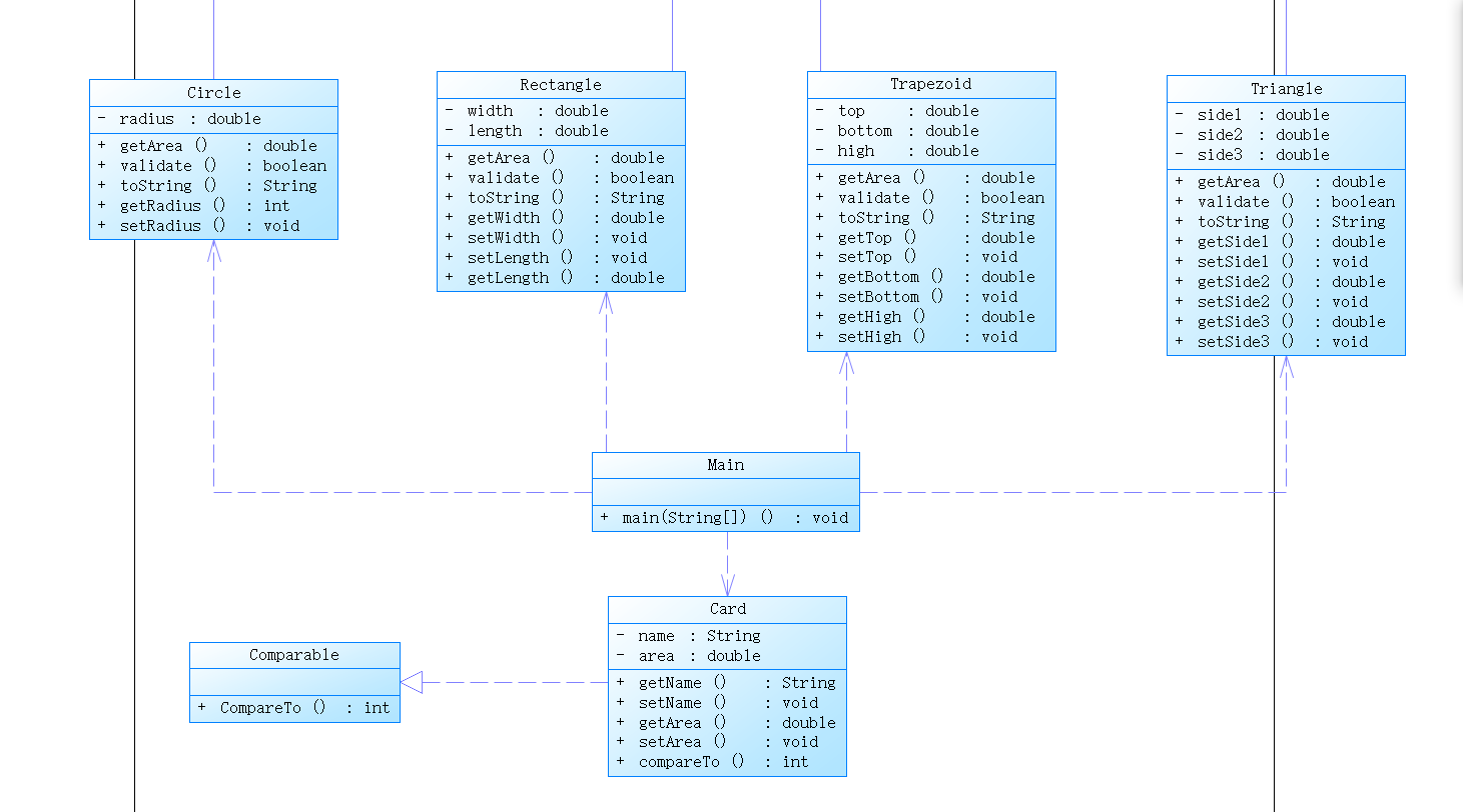 在题目集7中,代码共有四个实体类,分别为Circle类,Rectangle类,Trapezoid类,Triangle类,它们都继承了Shape类,拥有了Shape中的getArea()方法来求图形的面积,拥有validate()方法来判断输入的图形属性是否合法,拥有toString()方法。通过使用继承实现了代码的复用性,减小代码和数据的冗余度,大大增加程序的重用性。然后main方法通过创建Card对象,把所有每个Card对象存储在ArrayList中,然后通过sort()方法对Card对象排序即可以得到排序后的卡片,题目7-2和题目7-1不同的地方在于可以按照卡片类型分组输出卡片,而实现该要求的方法就是把不同类型的Card对象储存在不同的ArrayList中,然后再对不同的List进行Sort()排序即可实现该进阶要求。这次题目集主要是让我学会了ArrayList泛型的应用方法,Comparable接口及泛型的应用方法。