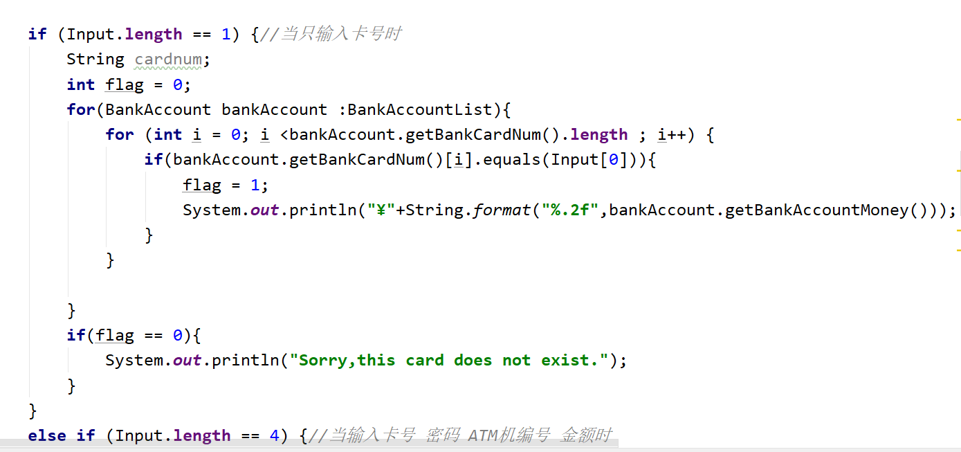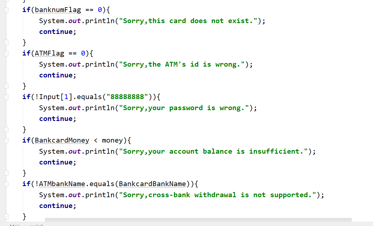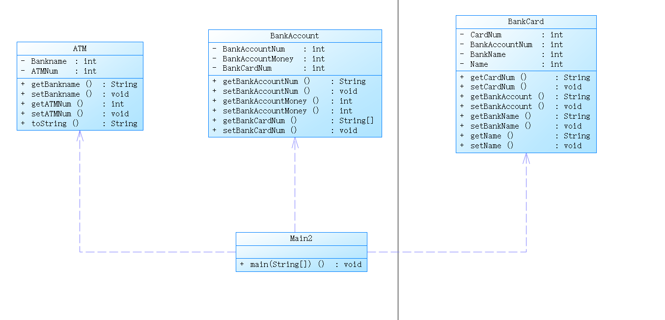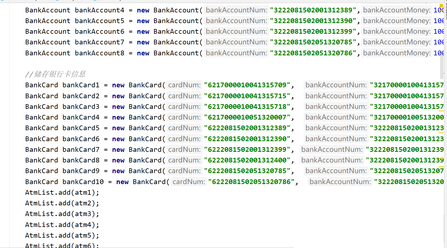一共有三个实体类,分别是ATM类,银行账户类,银行卡类,在mian方法中创建各个对象,然后把对象信息存储在ArrayList中,最后就能在main方法中编写相关逻辑代码实现银行的存款,取款,查询余额等操作。